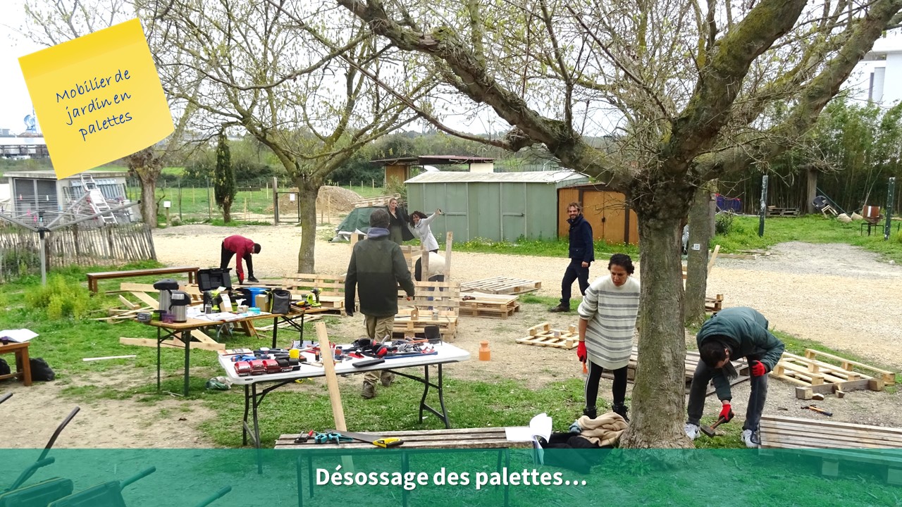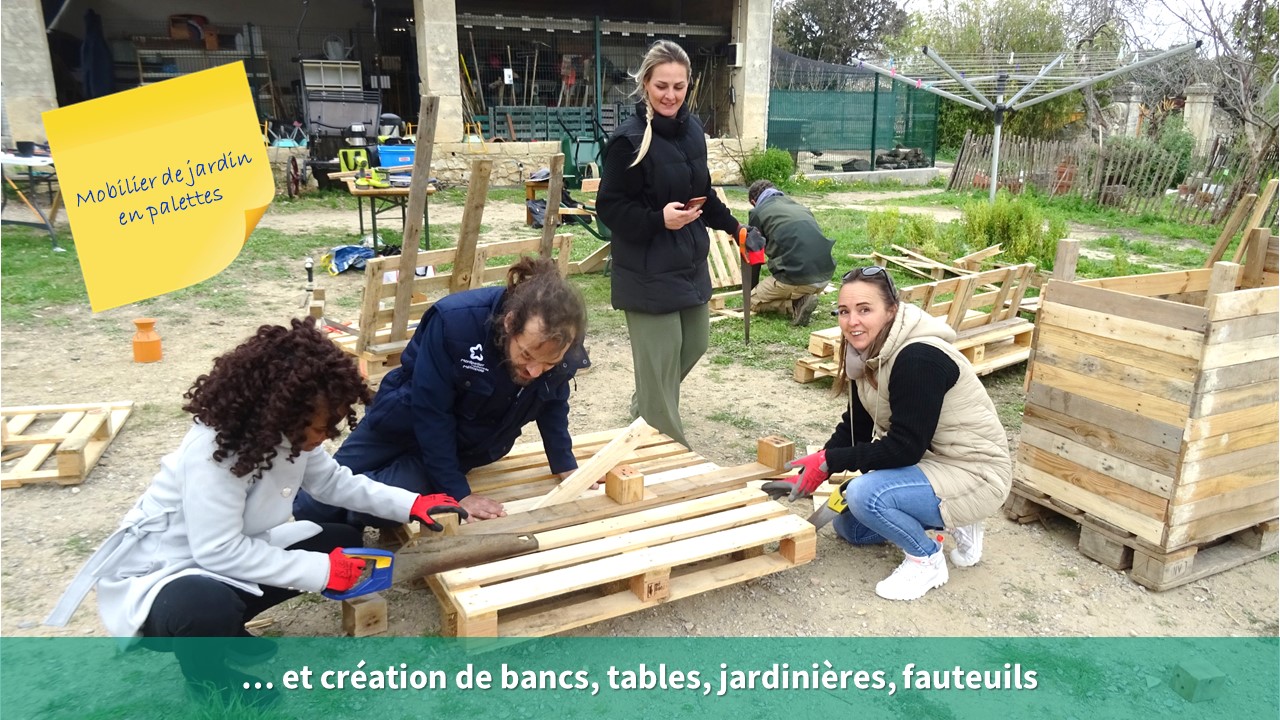 Cet atelier a réuni 12 agents éducatifs, mardi 23 mars à l’Écolothèque. Les participants ont appris à choisir correctement le bois à utiliser et comprendre les sigles inscrits sur les palettes afin d’éviter celles traitées chimiquement. Après avoir découvert les outils nécessaires et les consignes de sécurité, indispensables au bon déroulement de l’activité, chaque groupe a élaboré un projet de mobilier de jardin. Enfin, tous les pratiquants ont pu s’initier aux techniques de bricolage sur des palettes : déclouer, scier, changer les planches, réassembler, visser, poncer... Des bacs de jardinières, des bancs, des tables, des fauteuils ont vu le jour en matériaux de récupération. Ces meubles vont aller agrémenter les espaces pédagogiques dans les communes.